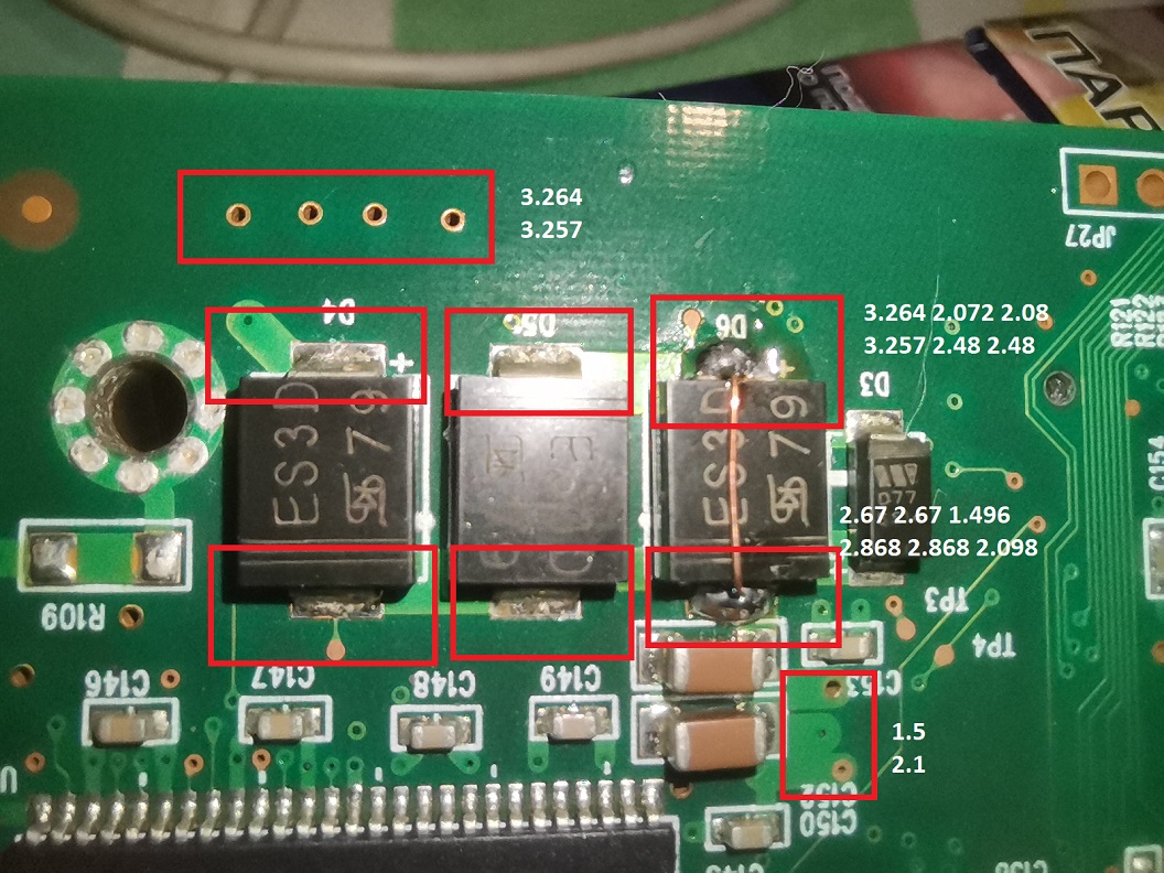 Да, действительно на проц питание занижено. Во вложении фото с замерами, верхняя строчка напряжения на плате которая не загружается, нижняя строчка напряжения с исправной платой. Не понятно почему у неисправной напряжение на диодах так падает сильно, вышел из ситуации замкнув D6. В целом проблема решена, благодарю за помощь