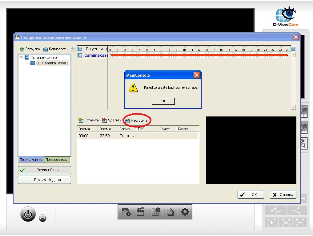 Добрый день. При попытке настройки задания по расписанию (выбор задания и нажатие кнопки настроить) выскакивает MessageBox с предупреждением Failed to create back buffer surface. При попытке закрытия диалогового окна оно возникает вновь. Дальнейшее использование программы невозможно. D-ViewCam можно в этом случае закрыть только через диспетчер задач. Пробовал устанавливать и с диска в комплекте и последнюю версию с ftp. Одно и то же. С чем может быть связана данная ошибка?