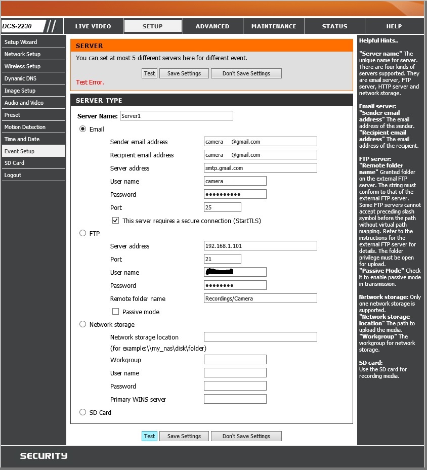 Имеется камера DCS-2230 с прошивкой 1.10.02 работает через роутер ASUS RT-66U, видео (фото) пишется на QNAP TS-112 (Surveillance station pro), настраиваю камеру через IE. После того как я в один прекрасный день вынул блок питание с розетки и через 10 мин. включил камеру обратно, перестал работать датчик движения на камере, в настройках он включен но реагировать на движения отказывается (включал, выключал ... менял чувствительность ) ни чего не помогает, может нужно еще что то нажать или какие манипуляции сотворить? Вторая проблема это отсылка снимков (по датчику движения) на почту , постоянно выдает Test error, пробовал вбивать почту Gmail, Mail.ru все одинаково ... не работает и все ... хотя на второй моей камере DCS-932L все замечательно работает. В чем проблема что я не так делаю?