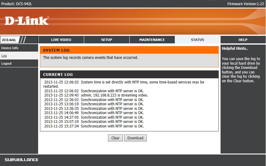 За лог спасибо, я верю, что синхронизация у Вас не работает. Но только почему она не работает - пока не понятно. Ниже скриншот, как это выглядит на моей камере DCS-942L за несколько часов.