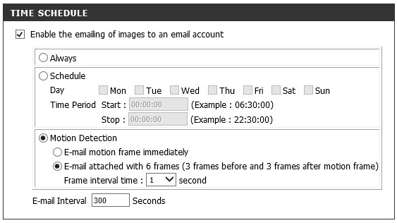 Enable the emailing of images to an email account при активации Motion Detection и выставленном E-mail Interval 3600 Seconds шлет на почту пачки фото как только заметит движение. Как сделать, что-бы фото приходило не чаще чем раз в 10-60 мин.?
