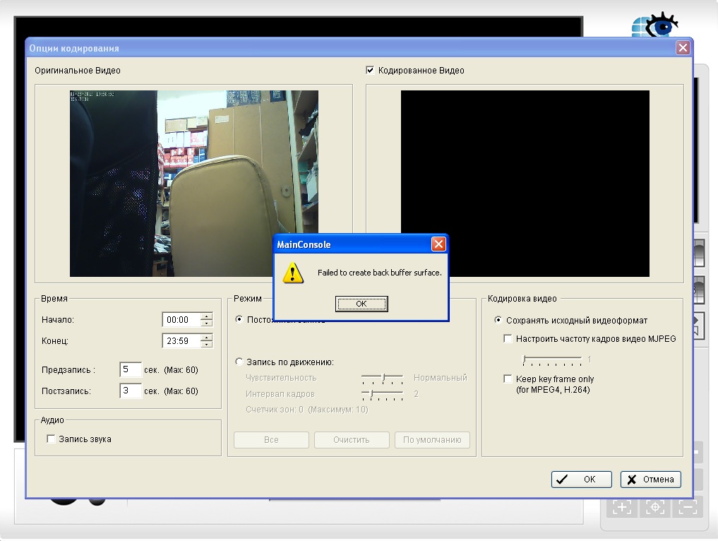 Добрый день. При попытке настройки задания по расписанию (выбор задания и нажатие кнопки настроить) выскакивает MessageBox с предупреждением Failed to create back buffer surface. При попытке закрытия диалогового окна оно возникает вновь. Дальнейшее использование программы невозможно. D-ViewCam можно в этом случае закрыть только через диспетчер задач. Пробовал устанавливать и с диска в комплекте и последнюю версию с ftp. Одно и то же. С чем может быть связана данная ошибка?
