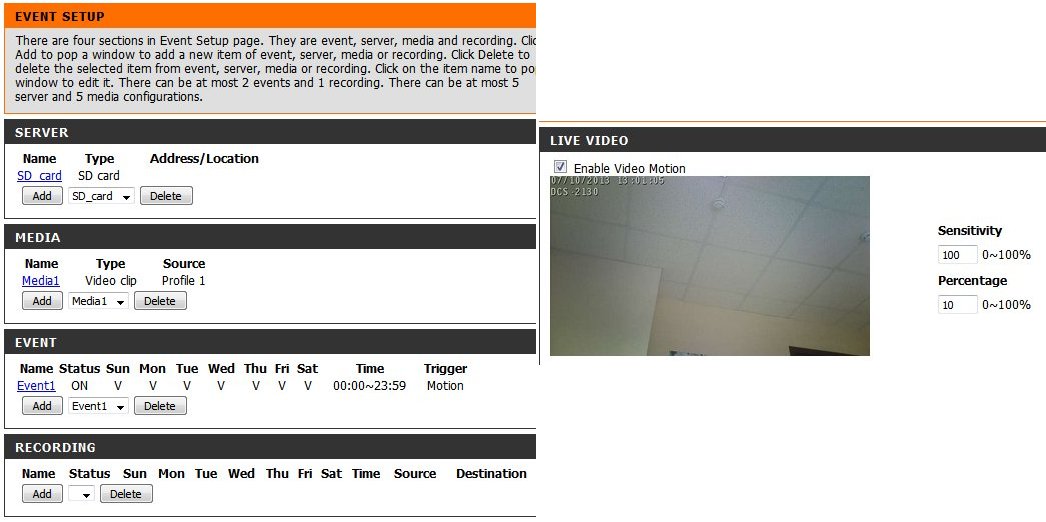 День добрый! Есть камера DCS-2130 Firmware Version 1.20.00. Не получается настроить запись видео на SD-карту при обнаружении движения. Скриншоты настроек во вложении. Карта подключена (SD Status: Ready), предварительно форматировал, при создании Server делал тест, пишет Test OK. В итоге на карту не пишется ничего. \Video\Event пустой. Делал запись по расписанию (Event setup -> Recording) - все работает как часы, видео сохраняется в \Video\Record\....... Подскажите, пожалуйста, как это побороть.