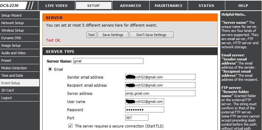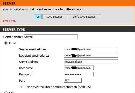 Вторая проблема это отсылка снимков (по датчику движения) на почту , постоянно выдает Test error, пробовал вбивать почту Gmail, Mail.ru все одинаково ... не работает и все ... хотя на второй моей камере DCS-932L все замечательно работает. В чем проблема что я не так делаю?