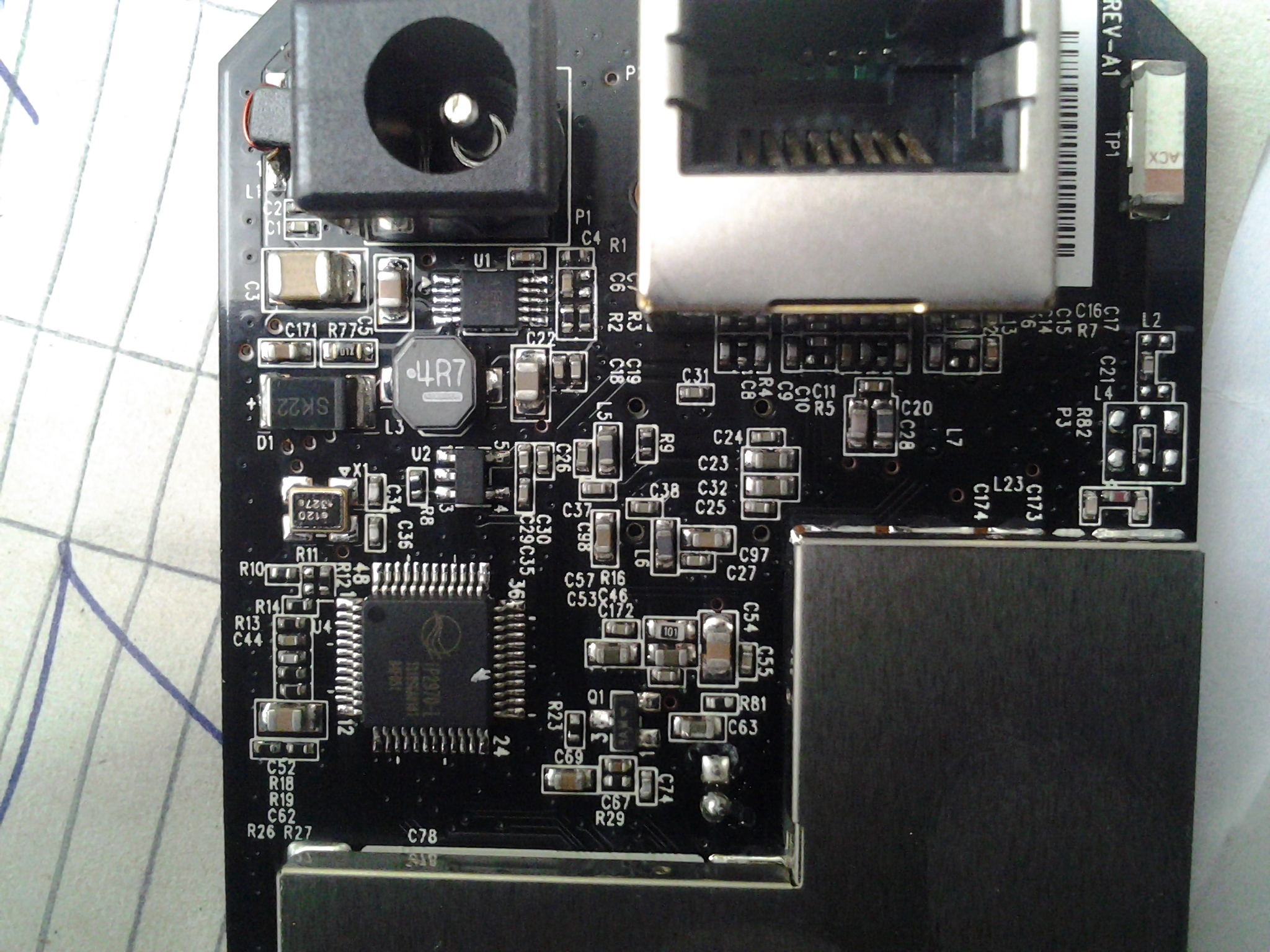 заодно, коль уже вскрыли корпус, усилим Wi-Fi антенну, на снимке возле сетевого коннектора видим брусок по имени ТР1