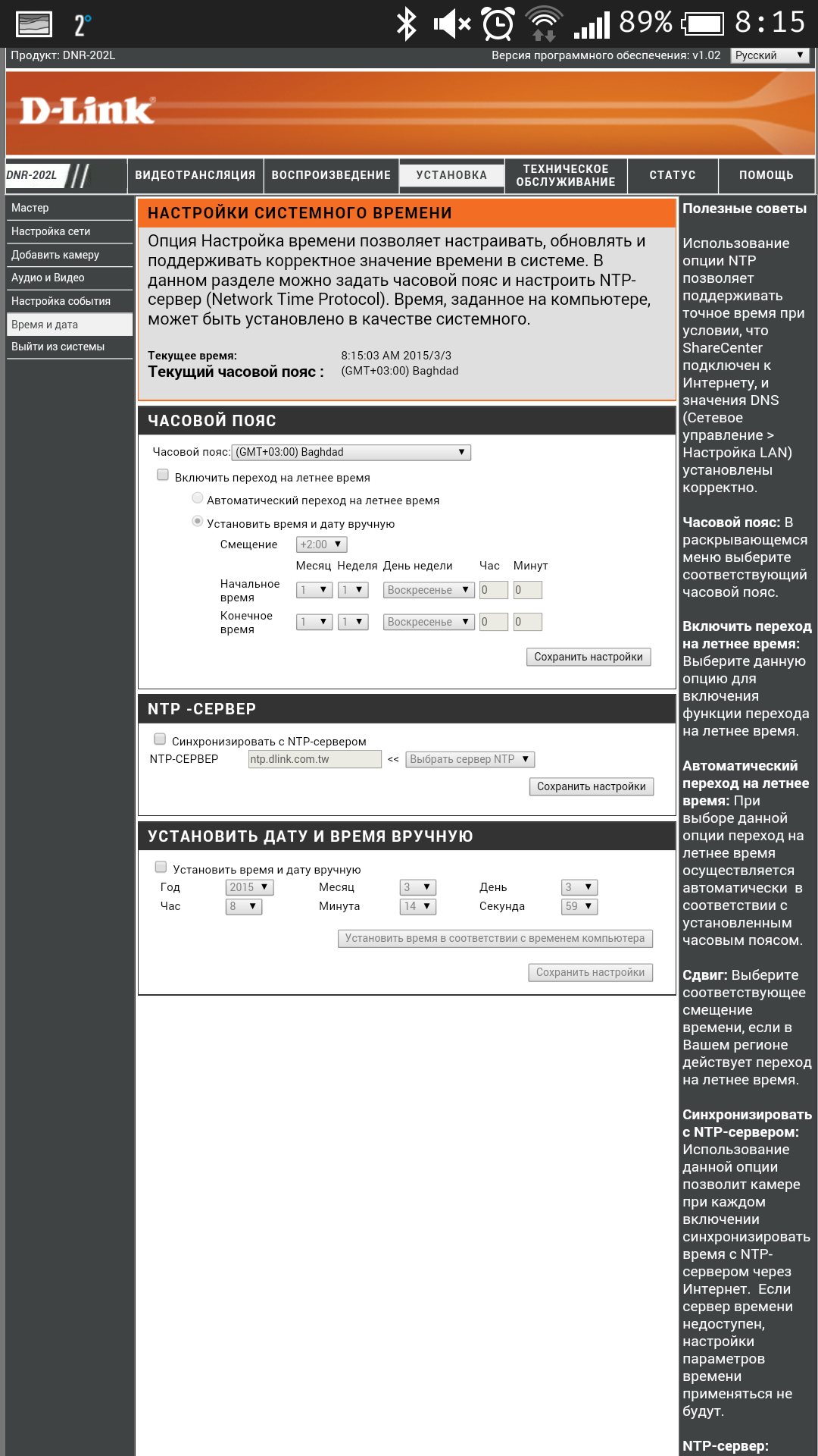 Еще у меня вопрос по поводу 322L. На камерах и регистраторе установлено время точно так же, как в данном случае. За разницей только в том, что на 322 не отключить синхронизацию с NTP сервером там указан ntp.dlink.com.tw. При просмотре первой страницы llive video. На камерах отображается время на час меньше, чем есть на самом деле, но в веб , на странице настройки даты и времени, время корректное и на регистраторе и на камерах. Что это может быть? Скриншот прилагаю!