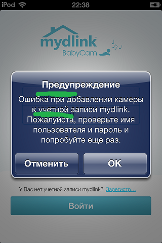 Вот с этим надо разобраться. Пользуйтесь приложением mydlink baby camera monitor при регистрации устройства. Опишите по шагам, что проделываете и на каком шаге возникает ошибка. Пришлите скриншот ошибки.