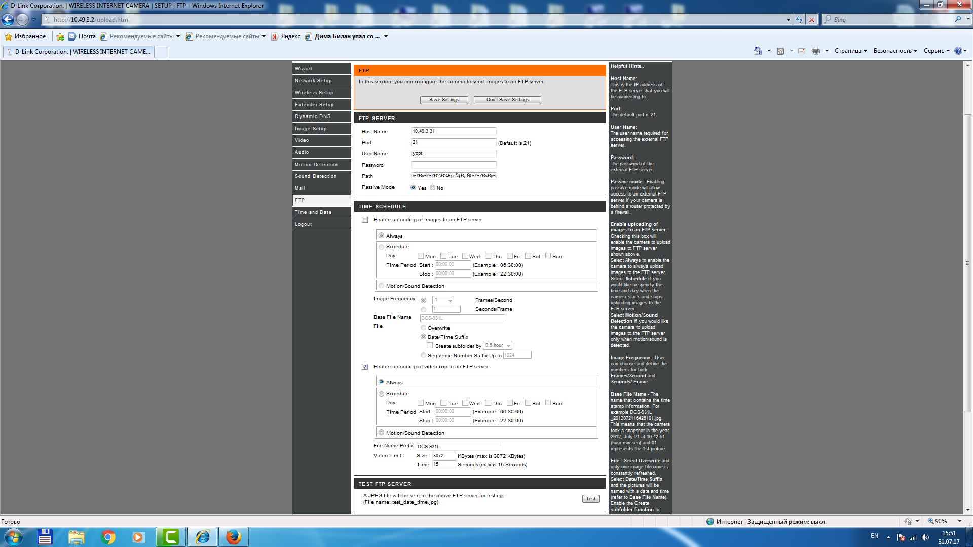Здравствуйте, DCS931l не хочет загружать видео на удаленный ftp (в локальной сети). FTP рабочий, настройки не поменялись (через ftp клиент подключается). Админы на этом ftp ничего такого не запрещали точно. Полгода писала, все было ок. Путь правда заколебался настраивать - русский язык она не понимает, кодировка windows1252, сохранил html файл с кодировкой windows1252 открыл в explore, скопировал в настройки все работало, теперь не хочет. путь такой: "/Главное управление/УОПТиАСР/__" . Can not connect to FTP server. Каким образом прописывать путь к ftp в этой камере (английский путь сделать не получиться) и почему пишет нет соединения с ftp - полгода же было, настройки не менялись. Через клиент все работает. Обновил прошивку на 1.14 - не помогло.