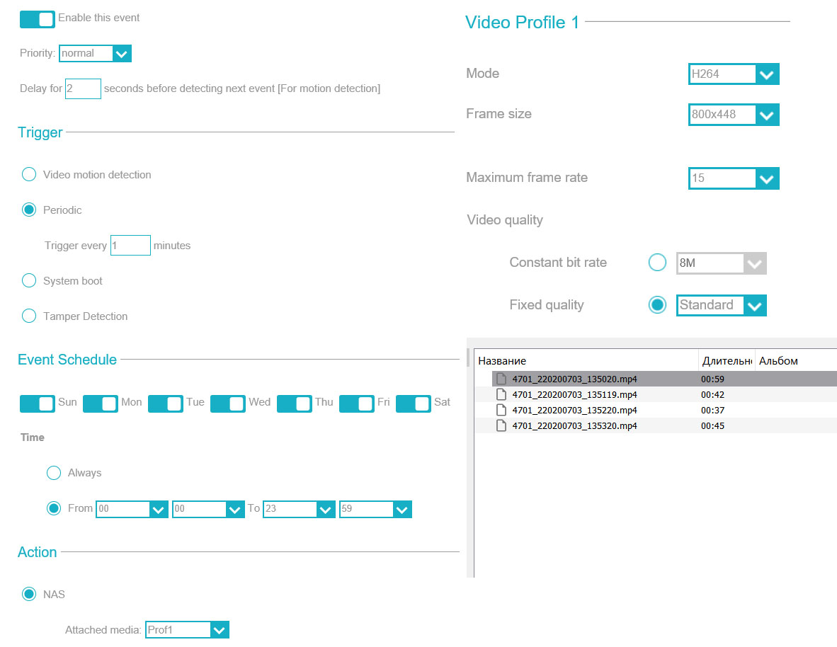 Лучше бы не писали про наличие SMB и FTP клиента так как это не о чем. Итог не возможно сделать реал.запись, из того что имеется "разрешение х кадры х поток" => будут пропуски, т.е. 60файлов по 1мин. их размерам по 4,6-5,0МБ реально может получиться файл не с 1мин а 30сек, 43сек, 55сек => в размер 6МБ уже уложилось бы 1мин.