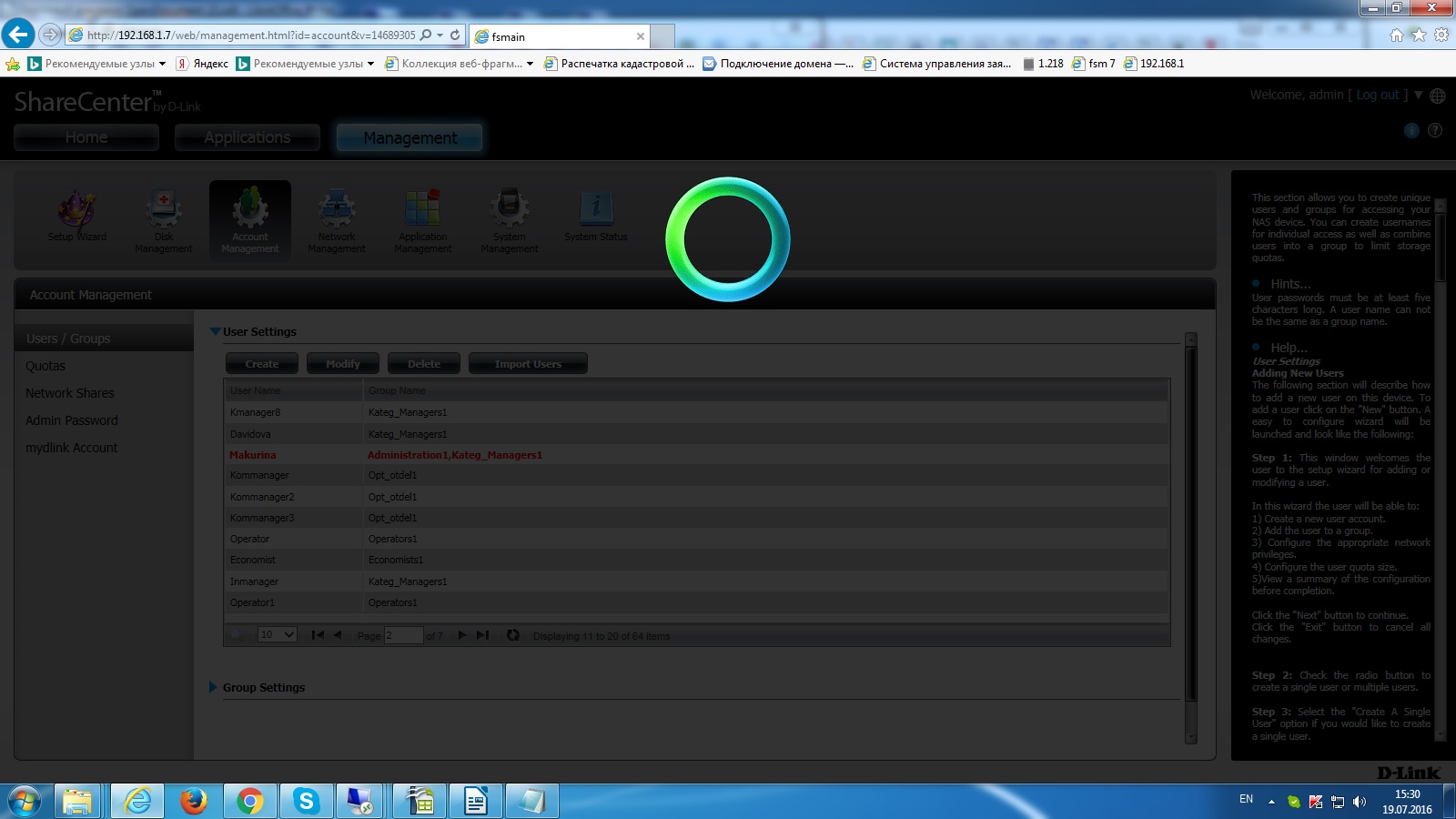 Завели 64 пользователея, 10 групп, 46 папок с настройками доступа. Теперь после модификации любого пользователя окно уходит в бессрочное ожидание! (рис.) При других манипуляциях устройство медленно но откликается. При обращении к нему ответа нет. Только спустя таймаут (5м) можно с ново к нему подключиться, с вводом логин пас. Пробовал разные ПК, разные браузеры, проблема та же. Подскажите как решить зависание после модификации пользователя?
