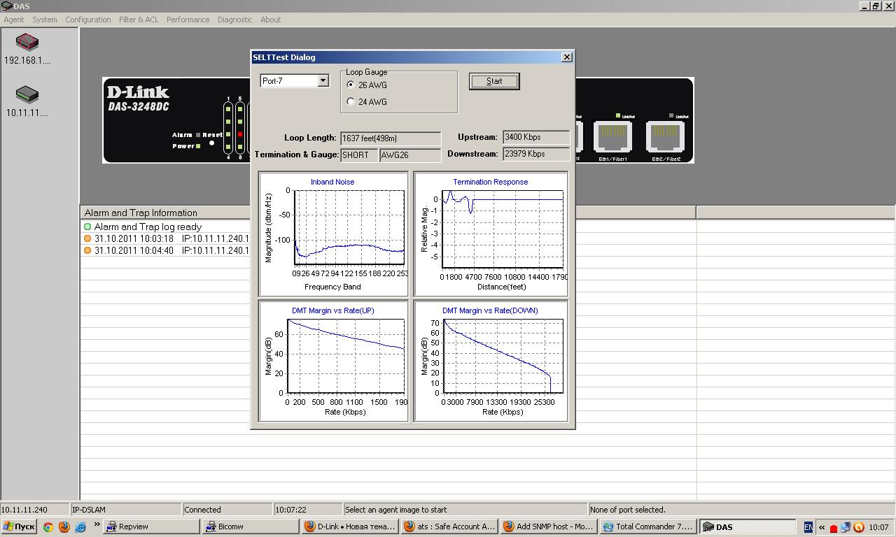 С помощью утилиты DAS (ver. 2.0.3, rel. 2010/12/10) пытаюсь сделать SELT-тест на абонентском порте. На каком бы я порте не делал тест, все время один и тот же результат. Длина линий до 1,5 до 3 км (по линейним даным). На линиях абонентское оборудование отсутствует.