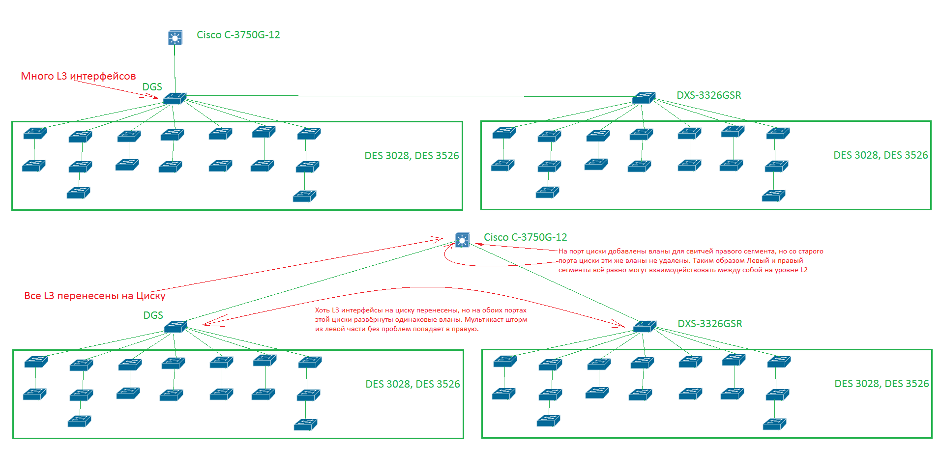 Здравствуйте. Имеется проблема с девайсом. В приложении конфиг, примерная топология и статистика загрузки CPU. Примерно в одно и то же время поднимается загрузка CPU до 40% и иногда начинает теряться пинг до него. Раньше перед этим свитчём стоял DGS и если на нём резать мультикаст (config traffic control), то мультикаст до DXS не доходил почти и загрузка проца там была в норме. Но в этом случает IPTV работает с очень большими тормозами. Сейчас DGS убрали и DXS воткнут в L3 циску. Была похожая проблема с таким же свитчём, но там загрузка всегда была 100%. Там проблема решилась отключением IGMP_snooping'a, загрузка упала до 5-8%. А с этим свитчём загрузка наоборт подскакивает до 100% после отключения IGMP_snooping'a. Подскажите как решать проблему?