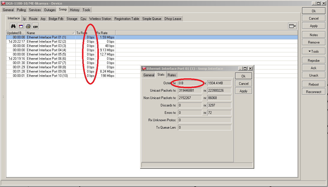 по всей видимости не может получить по SNMP количество переданых байт = 0