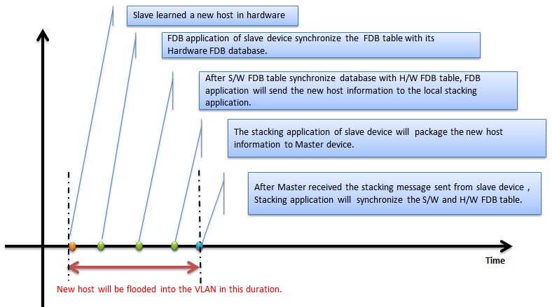 "If we want to improve the convergence time of FDB between master and slave, the only way is to adjust the packet path’s priority from Hardware receiving unknown host to stacking application sending “unknown host” information to master, such as from the orange point to blue point.