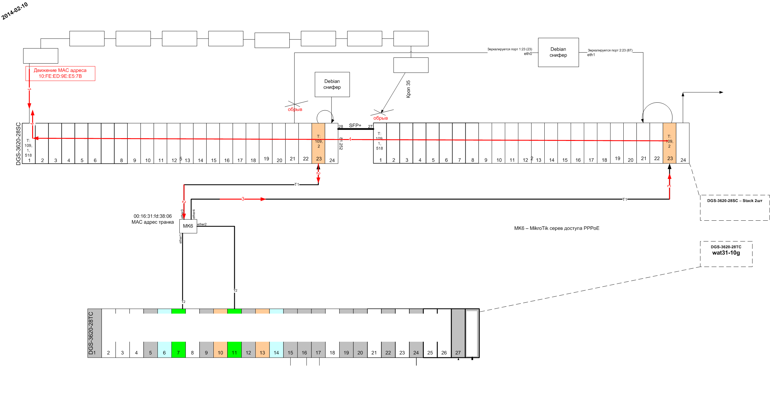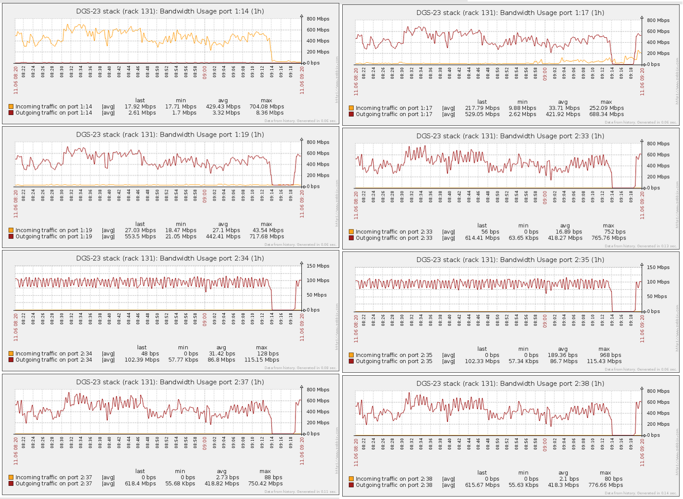 Ситуация следующая. Когда сервер, подключенный к LAG группе портов DGS-3120 стека (на изображении порт 1:14), начинает сливать бэкап на бэкап сторадж, стоящий в другой стойке, на все порты к которым подключены сетевые интерфейсы начинает идти флуд в том же объеме, в котором передается на бэкап сервер. Это видно по портам 1:17, 1:19, 1:33, 2:37, 2:38. К портам 2:34 и 2:35 подключены интерфейсы работающие на скорости 100Мбит/с. Соответственно их порт забивается полностью и интерфейсы становятся недоступными.