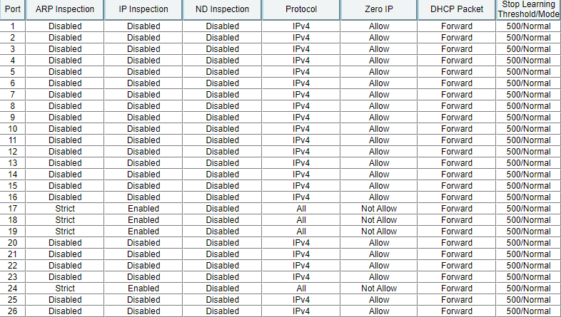 Здравствуйте, возникла проблема. До недавнего времени с данными на скринах настройками коммутатора всё работало нормально. Есть Wi-Fi, которая сеть закинута в отдельный VLAN и у нее свой DHCP сервер. Но в последнее время коммутатора почему-то стал банить эти устройства, и соответсвенно не выдавать пользователям доступ к сети. DHCP snooping вроде настроен верно, на коммутаторе включен. Как решить данную проблему?