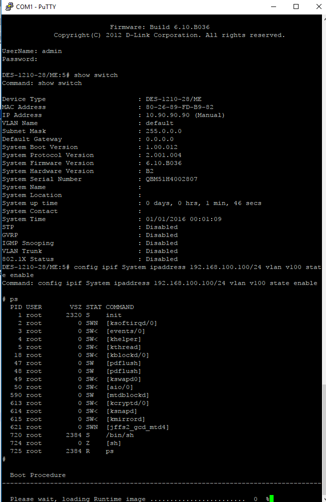 Добрый день. При смене IP адреса на коммутаторе выкидывает в консоль системы под РУТОМ! После чего происходит перезагрузка свича и опять по новой. Если закинуть в него отдельно config ipif System ipaddress 192.168.100.100/24 config ipif System vlan v100 config ipif System state enable то все гуд и дальше я могу его конфигурить. UPD: На прошивке 6.05.B040 такого нет. Второй свич, случайно взятый из кучи таких-же, ведет себя один в один.