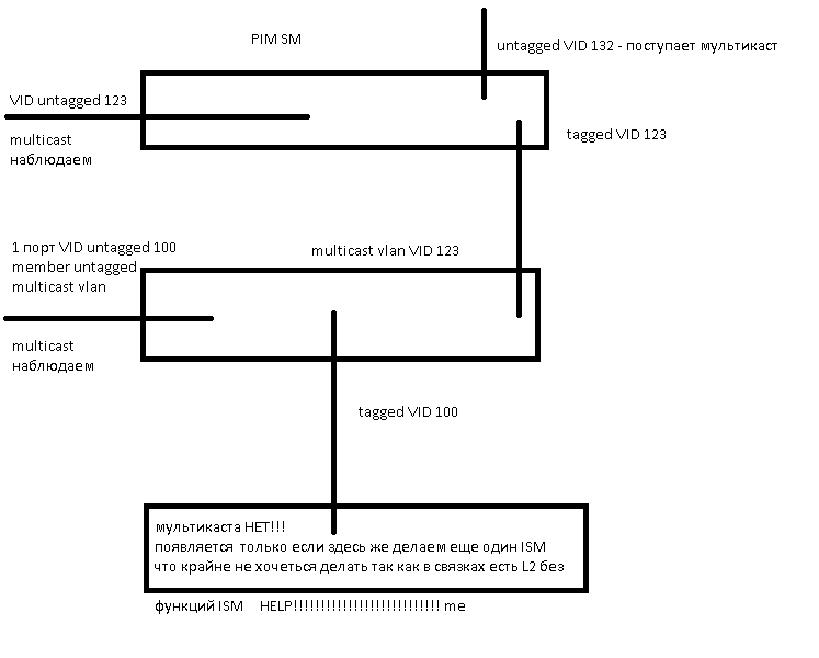 Я не приводил настроек на свитче - думаю дело не в них. Вопрос теории. Если есть устройство с ISM и к нему подключены цепочкой вниз управляемые коммутаторы с тем же самым VID что и на ISM и между ними тэгированный uplink - можно ли получить мультикаст где то внизу без поднятия ISM на самом последнем свитче?