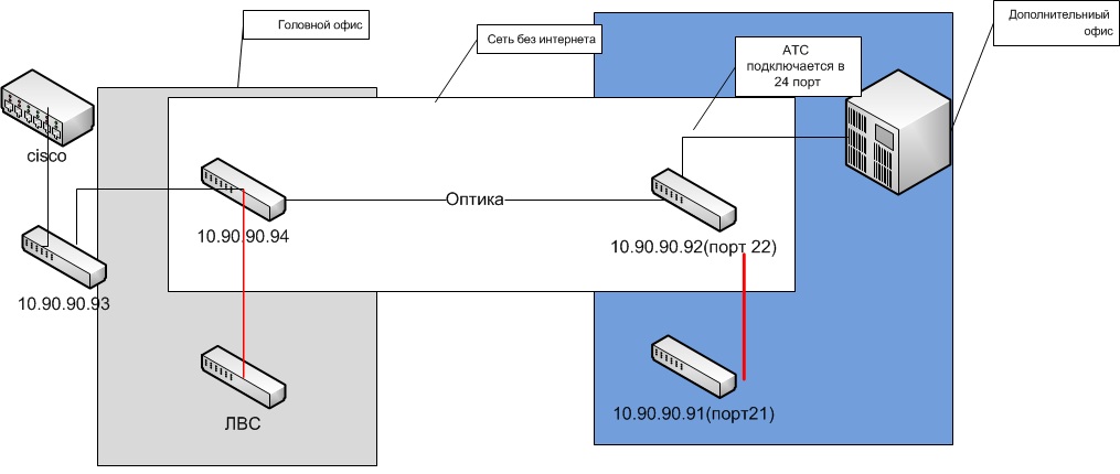 Имеются коммутаторы 10.90.90.94 и 10.90.90.92 соединены между собой оптическим кобелем и находятся в одной ЛВС Необходимо создать VLAN 1)Коммутатор 10.90.90.91 подключен через 21 порт к 10.90.90.92, через 22 порт должен получать доступ к сети ЛВС через 10.90.90.94 через 48 порт подключен к лвс. 2)АТС подключена к 10.90.90.92 через 24 порт и должна получает интернет от маршрутизатора Cisco через 10.90.90.93(16порт) подключенного к 10.90.90.94(48 порт)