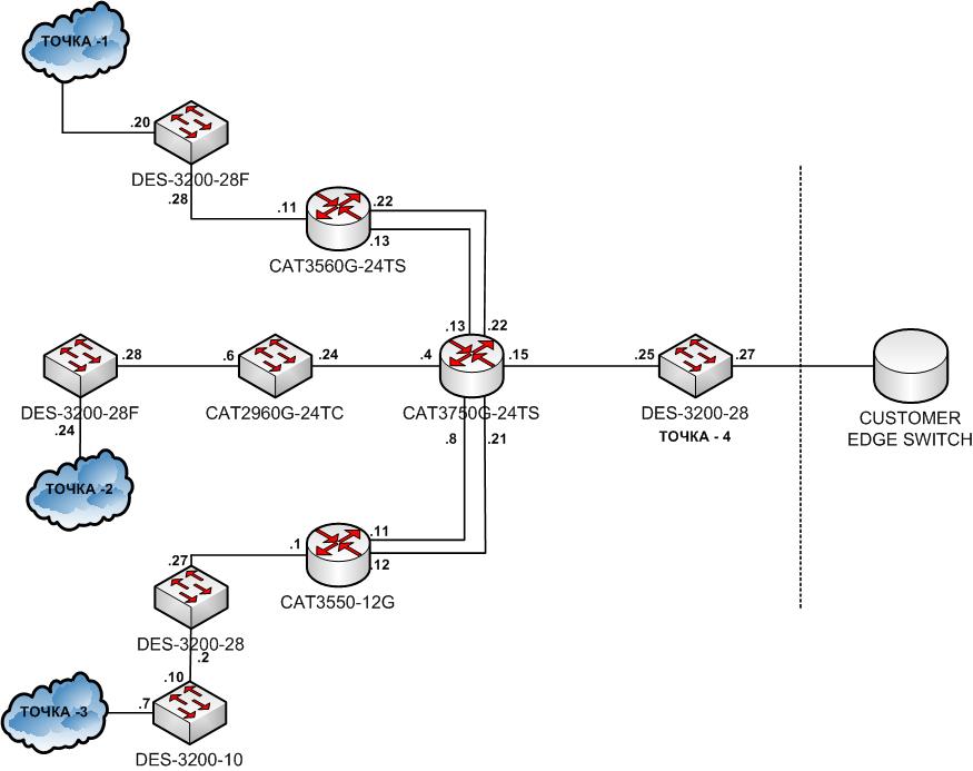Один из клиентов попросил у нас организовать QinQ VLAN для организации подключения в 3х точках (на рисунке : точка-1, точка-2, точка-3) и передачи всего трафика с этих 3х точек на точку-4.