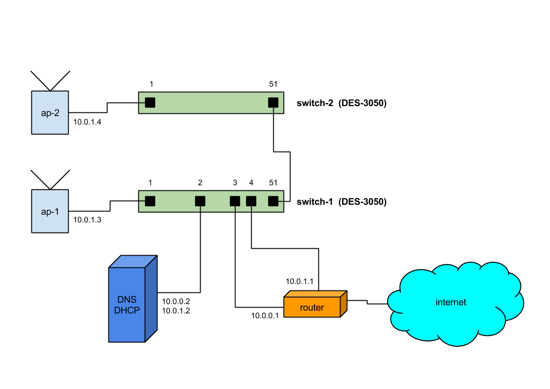 Пояснение.Создается отдельное адресное пространство 10.0.1.0/24 для WiFi. В отдельный VLAN нужно поместить точки доступа (AP), сервер DNS/DHCP (на базе Windows, DC, в DHCP создать мультизону и второй скоуп для 10.0.1.0) и второе подключение к роутеру (роутер к сожалению не допускает назначение второго IP на один внутренний интерфейс).