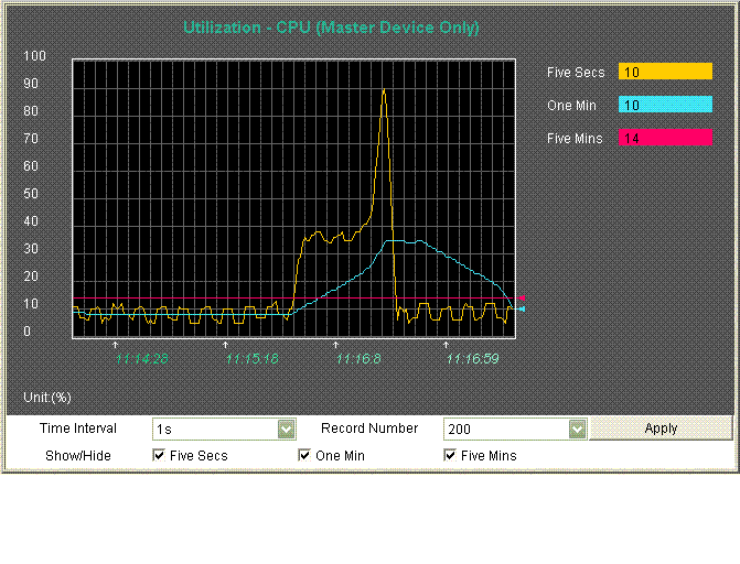 На данном коммутаторе разрулина вся маршрутизация сети + 2 мультикастовые netUP сервера. Примерно с одинаковой периодичностью (раз в 5 минут) загрузка CPU возрастает с 10 до 90 %.