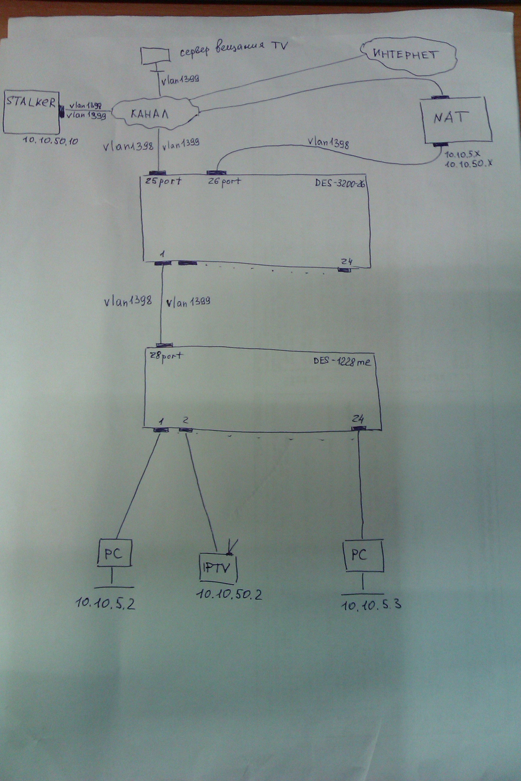 Имеем следующую схему сети (см.картинку). des3200-26 настроен как querier, des-1228me на доступ. При подключении к 26 порту des3200-26 NATа картинка у абонента начинает сыпаться. После долгих тестирований выяснили (заснеферили трафик на stalker), что в общий канал c 25 порта (в сторону сталкера и сервера вещания) в 1398 vlanе начинает переть трафик с ната - broadcast и unicast PC сети - 10.10.5.X. Так как уже перепробовали все варианты, думаем что именно это является причиной рассыпания картинки (левый траф сети 10.10.5.X просто забивает канал для мультикаста и 10.10.50.X сети). Вынести NAT и PC подсеть в другой vlan не можем так как на доступе должно быть только два vlan - для мультикаста (multicast vlan1399) и остального трафика (vlan1398) (iptv приставкам и PC тоже нужен интернет). Сейчас хотим просто проверить эту теорию запретив на 25 порту des3200-26 в сторону канала весь трафик из левых подсетей (т.е. PC - 10.10.5.X). Т.е. чтобы был только multicast в канале и трафик приставка<->stalker.