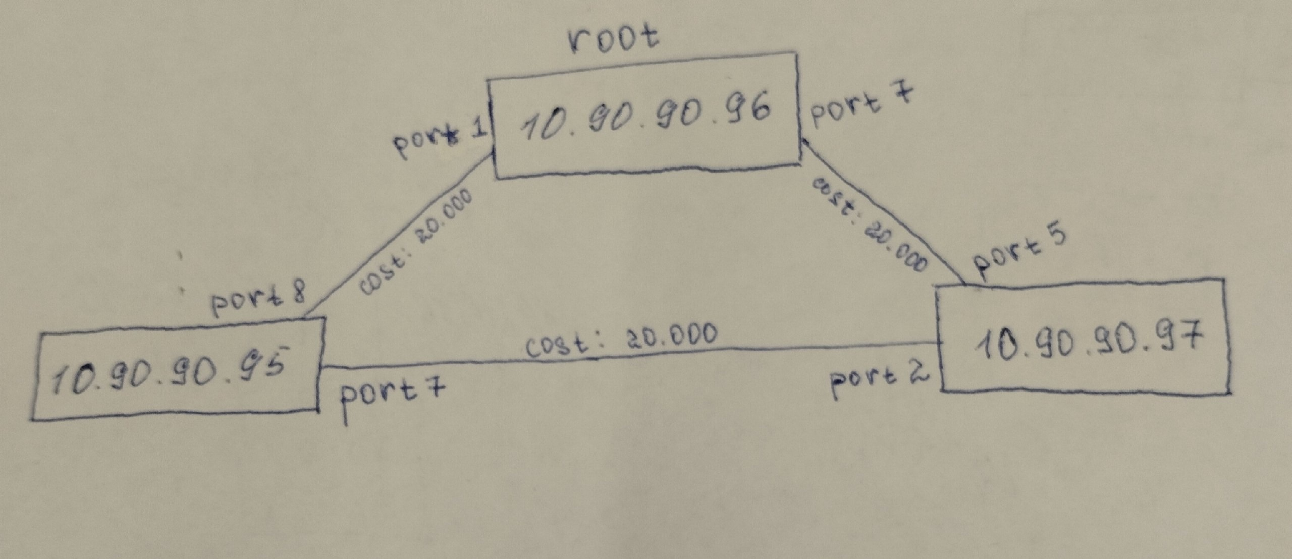 Вся топология выглядит следующим образом: Имеются 3 коммутатора(10.90.90.95, 10.90.90.96, 10.90.90.97), которые подключены между собой, в каждом включен протокол RSTP.
