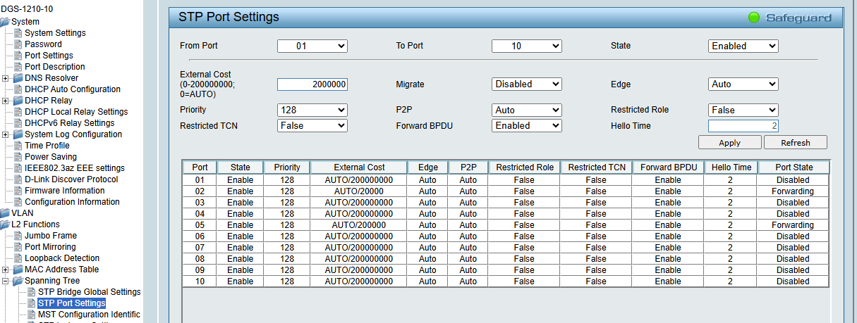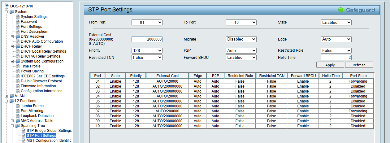 Добрый день. Коммутаторы dgs-1210-10 ревизия Fx, прошивка 6.32 B019. Возникла проблема с RSTP: при изменении скорости портов на более плохую(например, с 1000М на 100М) в System->Port setting, изменения отображаются в L2 Functions->Spanning Tree->STP Port Settings в поле External Cost, НО порты в топологии не переназначаются, хотя есть маршрут с меньшей стоимостью(есть более выгодные маршруты).