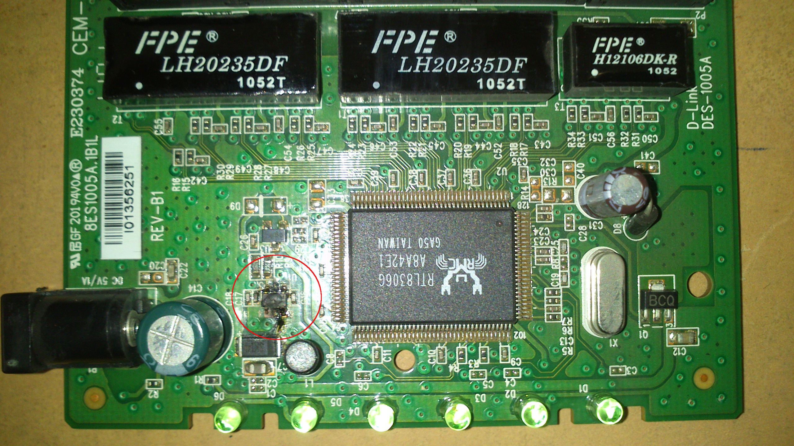 По сети похоже прилетел "бросок" и вывел из строя хорошую вещь - D-Link DES-1005A, думали просто блок питания полетел, починили, но вот сам коммутатор не завёлся пришлось препарировать пациента и внутри обнаружили "злокачественное выгорание" неизвестного элемента (см. вложенное фото в кружке). Подскажите люди добрые что это за элемент/модификация/модель в общем что заказать в магазине электронных компонентов?)