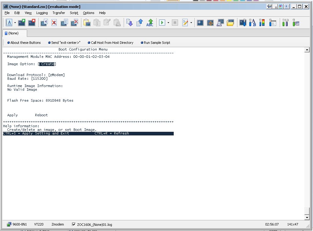 Имеется коммутатор DES-3200-18 (H/W ver.:B1). При подключении консольного кабеля в программе ZOC отображается Boot Configuration Menu, в котором сказано, что Management Module MAC Address: 00-00-01-02-03-04 и нет прошивки (No Valid Image). Прошивается различными прошивками для DES-3200-18 (от DES-3200_Series_A1_B1_Run_v1.28.009.had и DES-3200R_1.83.B009.had до DES-3200_Runtime_V1.85.B007.had). После успешной заливки, прошивка применяется (Program Runtime image .... 100%), но коммутатор опять жалуется на отсутствие пошивки. Прошивался Boot Prom DES-3200_prom_1.00.B003.had и DES-3200_prom_1.00.B003.had. Они прошиваются успешно (меняется версия в Boot Configuration Menu).