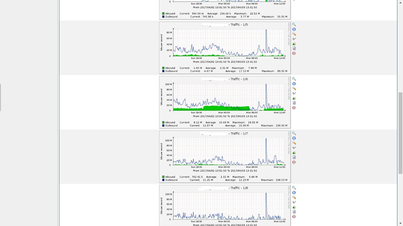 Секунд 30 - 40 тормоз дикий, потом по пускает. Приложу картинку скачков трафика в cacti. Такой скачок, абсолютно на всех свитчах.