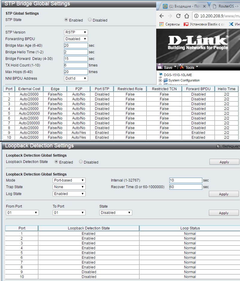Что конкретно Вы настроили из функционала RSTP и LBD? Приведите пожалуйста список команд.