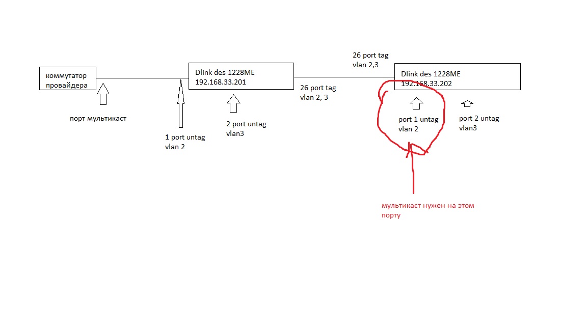 Здравствуйте. Необходимо получать на 1 порт коммутатора 202 мультикаст. На vlan 3 мультикаст не нужен. Оба коммутатора DES 1228ME REV.A2, Firmware: Build 1.60.B04. Кроме вланов на схеме, есть vlan управления, все остальное по дефолту. Схема во вложении. Очень нужна помощь, с мультикастом дело не имел :oops: