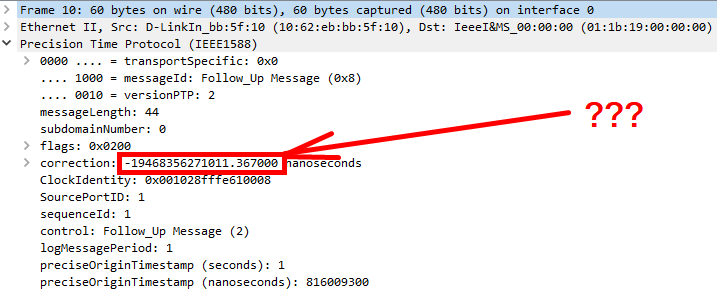 Пытаемся использовать PTP. В режиме Boundary работает нормальною. В режиме E2E выдает очень большое, к тому же отрицательное значение в поле correction в пакете Follow_Up. Поле correction - это время пребывания пакета в коммутаторе (residence time). Входные пакеты коммутатора имеют нулевое значение в этом поле. Косяк в прошивке коммутатора? Или что-то неправильно настроено?