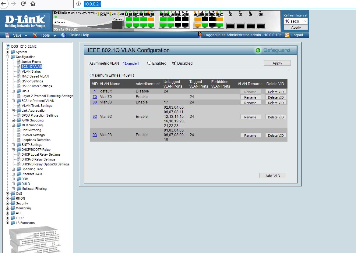 VID : 93 VLAN NAME : Vlan93 VLAN Type : Static VLAN Advertisement : Enabled Member Ports : 1,3-10,24 Tagged Ports : 24 Untagged Ports : 1,3-10 Forbidden Ports :