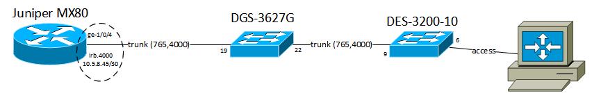 Далее ниже по схеме подключен DGS-3627G. Тут просто создан 4000 vlan, который в транке отдаёт в 19 и 22 порты.