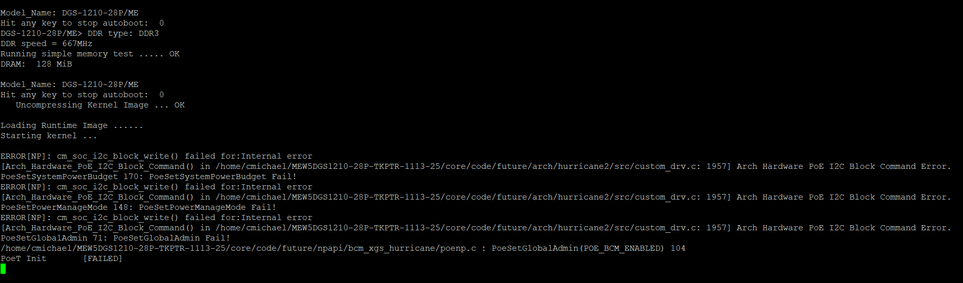[Arch_Hardware_PoE_I2C_Block_Command() in /home/cmichael/MEW5DGS1210-28P-TKPTR-1113-25/core/code/future/arch/hurricane2/src/custom_drv.c: 1957] Arch Hardware PoE I2C Block Command Error.