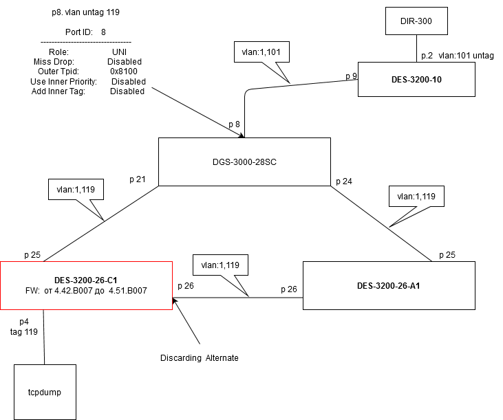 Самое еще интересное если на проблемном DES-3200-26-C1 - убрать с 26 порта 119 - ничего не меняется, пакет все равно туда уходит, петля остается.