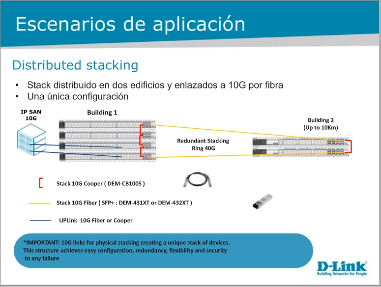 Всех приветствую! Пытаюсь собрать в кольцо стек из четрыех коммутаторов DGS-1510-52X / A2. Планируется что один из них физически будет находится в соседнем корпусе и соединен с остальным стеком с помощью пары трансиверов DEM-432XT (подобная схема была взята из презентации D-link по серии DGS-1510)