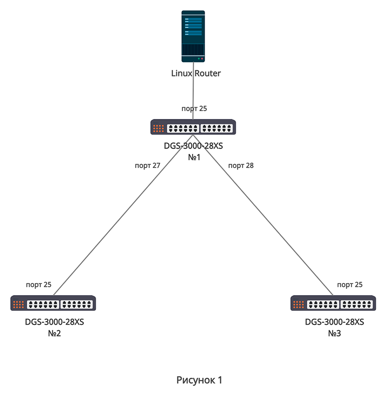 Имеется три коммутатора DGS-3000-28XS. Схема подключения показана на Рисунке 1.