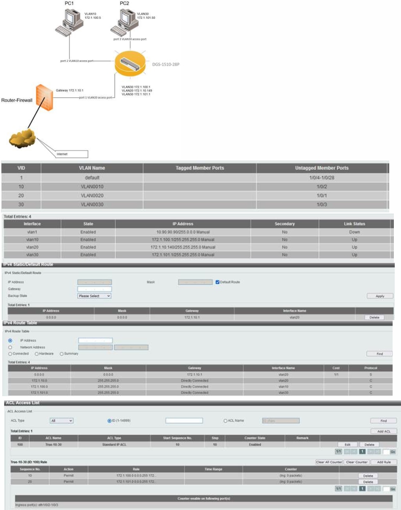 Пинг от PC1, ID10 к интерфейсу DGS-1510 VLAN10 работает, но ping от sme PC1, ID10 к интерфейсу DGS-1510 VLAN30 не работает. В прикрепленном файле есть картинка.