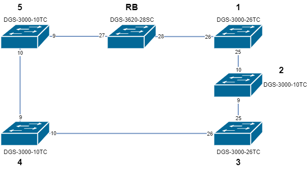 Имеется свич DGS-3620-28SC (он у нас выступает как RB), а также 3 свичей DGS-3000-10TC и 2 штуки DGS-3000-26TC (см. схему).