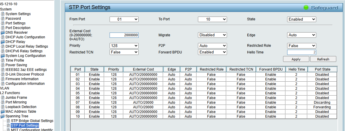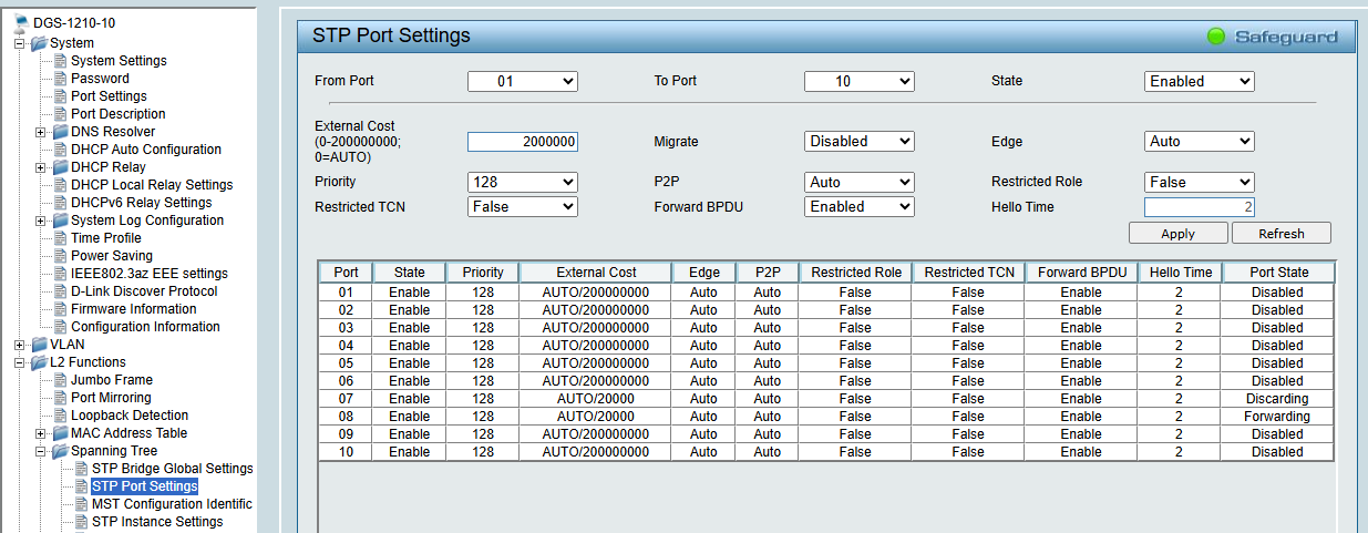 Добрый день. Коммутаторы dgs-1210-10 ревизия Fx, прошивка 6.32 B019. Возникла проблема с RSTP: при изменении скорости портов на более плохую(например, с 1000М на 100М) в System->Port setting, изменения отображаются в L2 Functions->Spanning Tree->STP Port Settings в поле External Cost, НО порты в топологии не переназначаются, хотя есть маршрут с меньшей стоимостью(есть более выгодные маршруты).