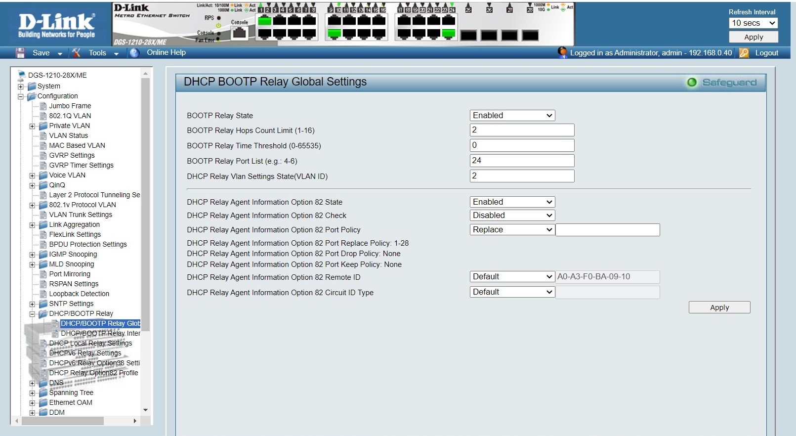 Здравствуйте. Прошу совета в настройке dhcp relay на коммутаторе DGS-1210-28X/ME.