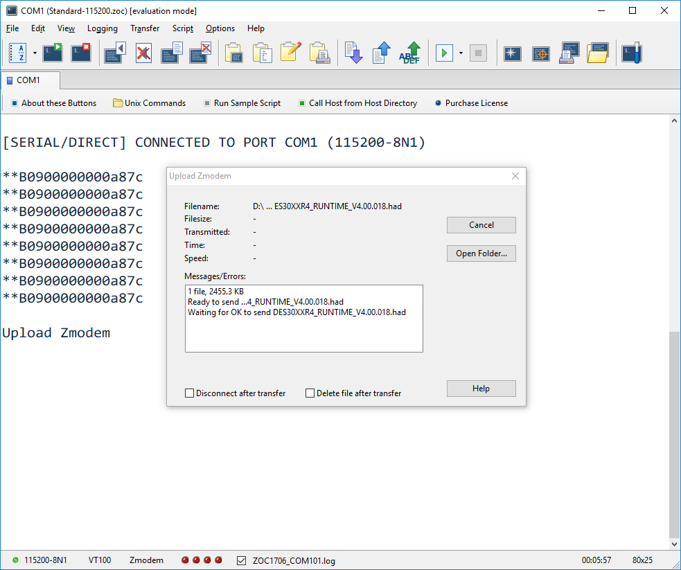 ZOC7 при подключении на скорости 115200 после перезапуска коммутатора начинает передачу но сразу ошибки и не может корректно передать даже килобайт, прогресс сбрасывается на 0.