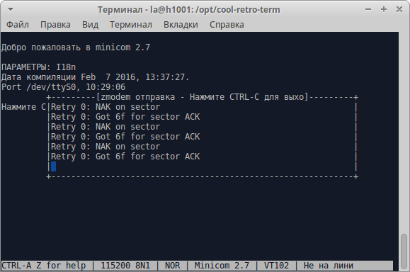 Пробовали hyperterminal, minicom передача не начинается, хотя приглашение видим.