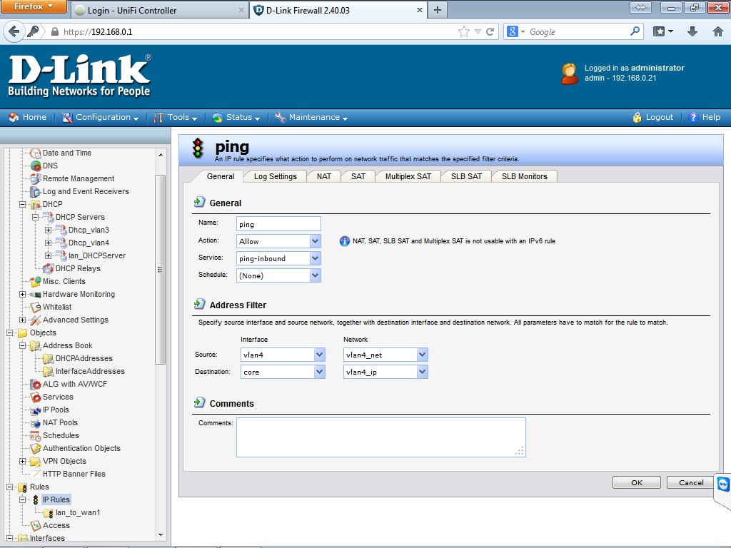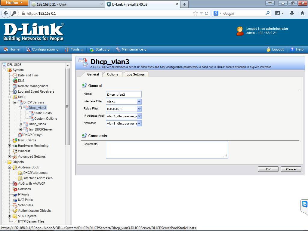 Создаю на dlink 860 vlan-ы, создаю пулы для получения адресов dhcp, маршруты автоматом прописываются при создании vlan. Создаю правило для хождения трафика от vlan наружу и к dlink 860, но адресов не получаю, т.е. выходит что dhcp не раздает адреса. Пингую созданные vlanы, пинг проходит. Думаю, что ошибка в правилах хождения трафика :(