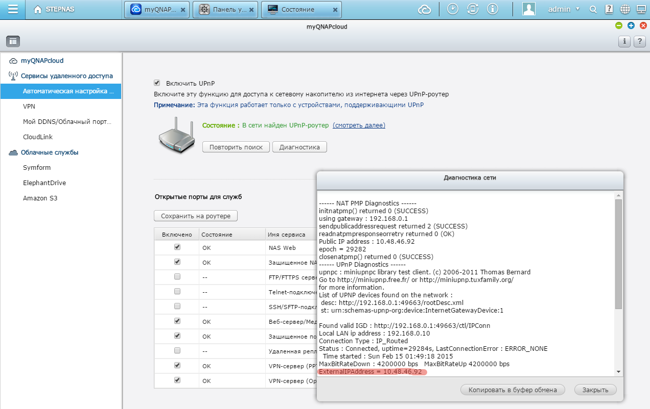 На сайте 2ip.ru мой IP-шник показывает один, а при диагностике сети из QNAP мой "ExternalIPAddress" показывает другой (см. скрины).