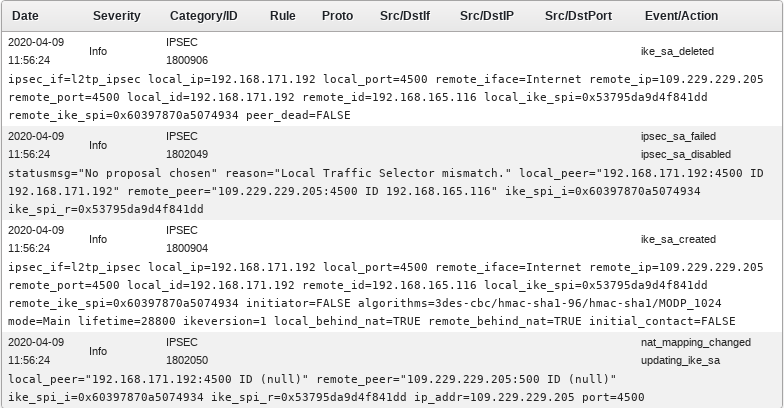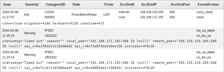 statusmsg="Timed out" reason="" local_peer="192.168.171.192:500 ID (null)" remote_peer="109.229.229.205:500 ID (null)" spi_i=0x1db073dd8bd89c9a spi_r=0xb8a17ac633a773c2 initiator=FALSE